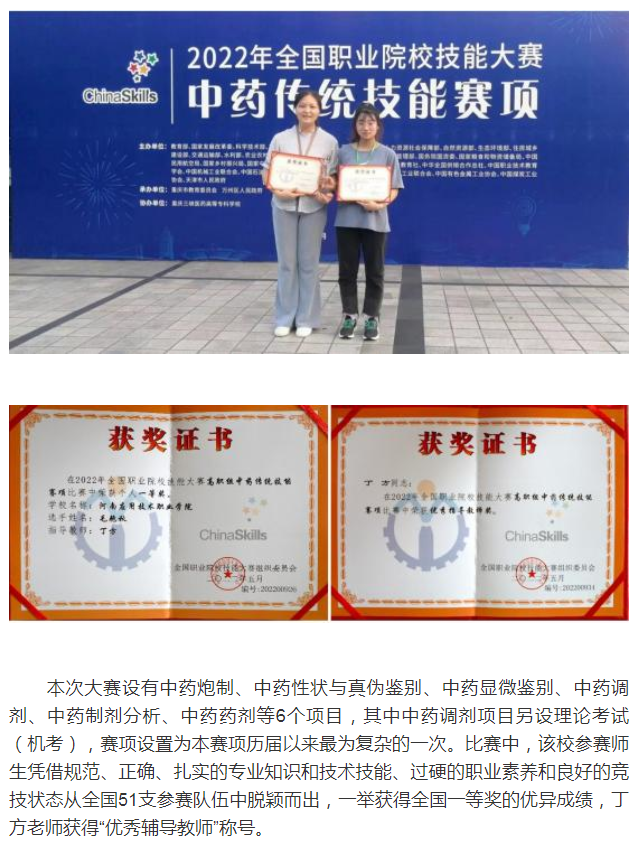 7月28日-7月30日,2022年全国职业院校技能大赛高职组“中药传统技能”赛项在重庆三峡医药高等专科学校展开比拼,河南应用技术职业学院医药学院毛艳秋同学以总分第三名的优异成绩斩获国赛一等奖,取得了该校自参加全国职业院校技能大赛高职组赛事以来的最好成绩。同时也是2022年全国职业院校技能大赛(高职组)河南省参赛队的首金。