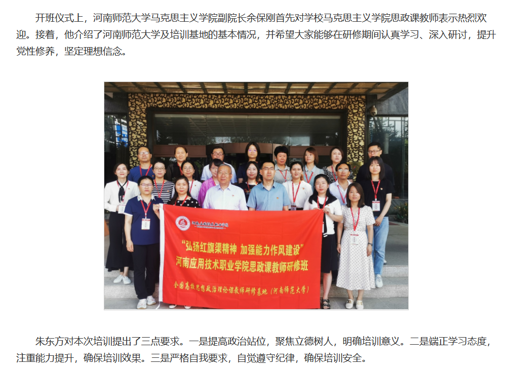 8月6日,河南应用技术职业学院马克思主义学院“弘扬红旗渠精神 加强能力作风建设”思政课教师暑期研修班顺利开班。学校党委副书记朱东方出席并发表重要讲话,马克思主义学院全体教师参加开班仪式,会议由马克思主义学院院长张振华主持。