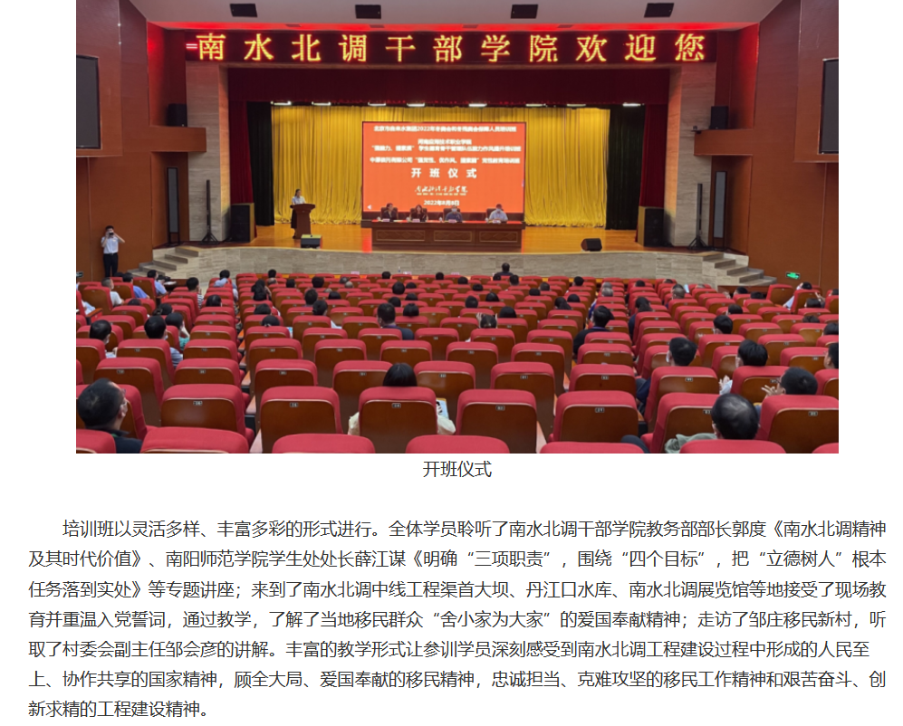 为深入贯彻落实立德树人根本任务,加强学生管理队伍建设工作,进一步推进能力作风建设年活动走深走实,2022年8月8日至8月11日,河南应用技术职业学院组织学生管理工作队伍赴南水北调干部学院开展能力作风提升培训。本次培训以“强能力、提素质”为主题,由副校长刘振民带队,来自学生工作部、团委、心理健康教育中心、保卫处、二级学院(部)的62名一线学生管理工作人员参加培训。
