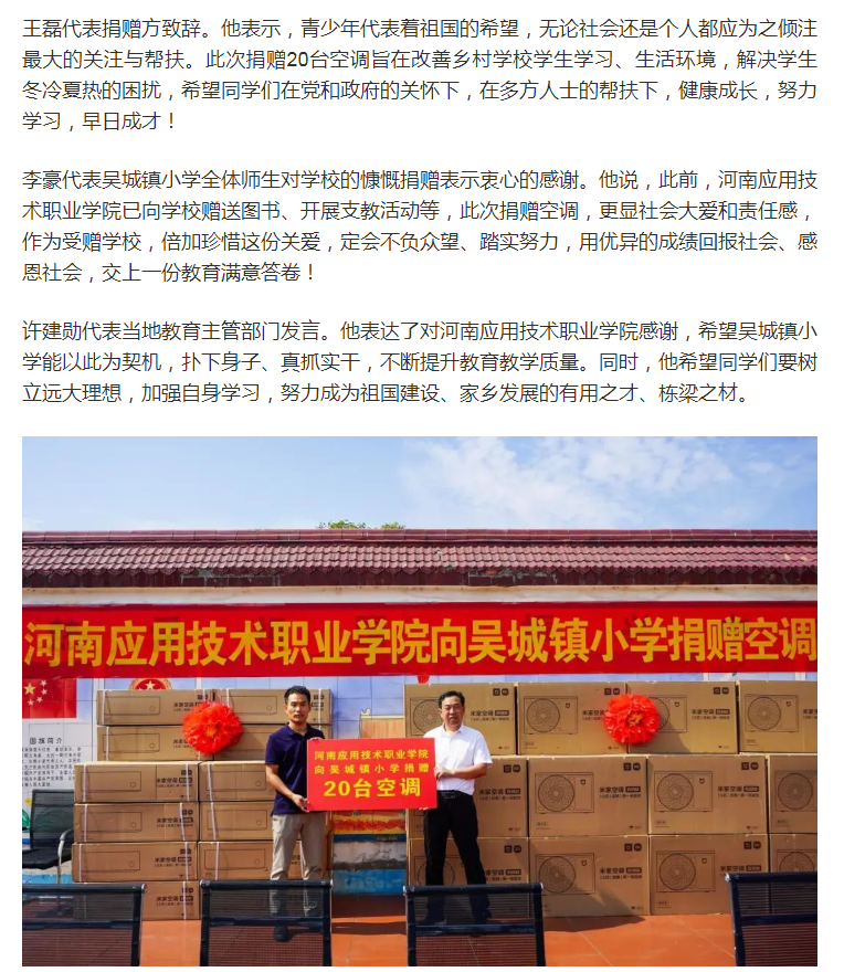 为助力乡村教育振兴,深化教育帮扶力度,9月30日,河南应用技术职业学院党员志愿者一行前往桐柏县吴城镇小学开展“金秋送暖 爱心护航”空调捐赠活动。校党委组织部副部长刘钊、党委宣传(统战)部副部长王磊、桐柏县新时代文明实践中心主任刘家顶、桐柏县教育局副局长许建勋、桐柏县吴城镇小学校长李豪等出席捐赠仪式,吴城镇小学全体师生参加仪式。