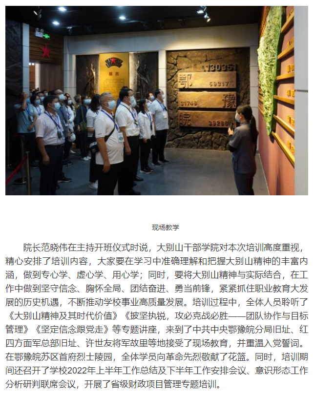 7月25日—7月29日,河南应用技术职业学院组织全体中层及以上干部到位于信阳新县的大别山干部学院,开展了为期五天的“能力作风建设年”活动专题培训,学校领导班子成员、中层干部参加了本次培训。开班仪式上,党委书记闫俊山对本次培训提出三点要求,一是提高政治站位,深刻领会这次培训的重要意义。二是明确重点任务,全面提升综合能力素质。三是精心组织安排,确保培训活动取得实效。