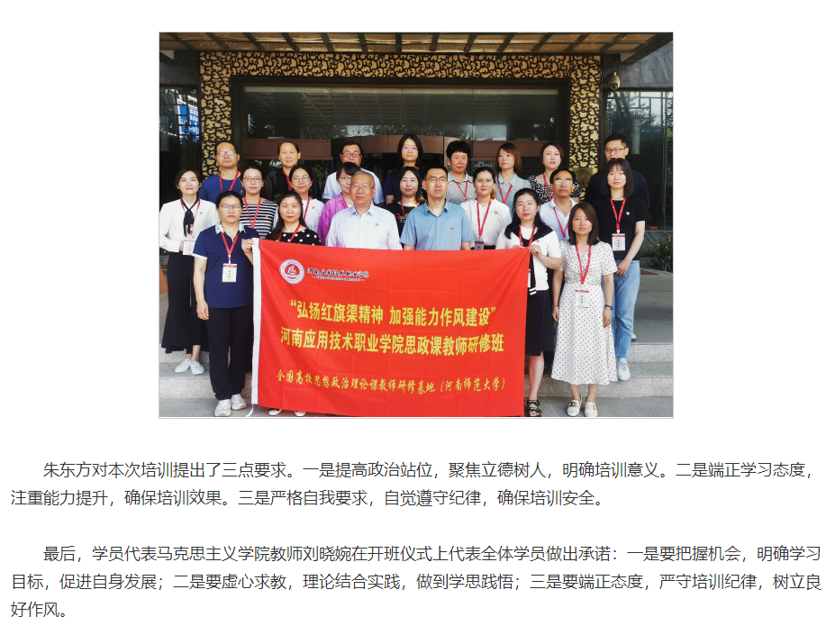 上一条:河南教育宣传网:河南应用技术职业学院马克思主义学院暑期思政课教师研修班开班 下一条:河南日报:河南应用技术职业学院举办中层及以上干部“能力作风建设年”活动专题培训班