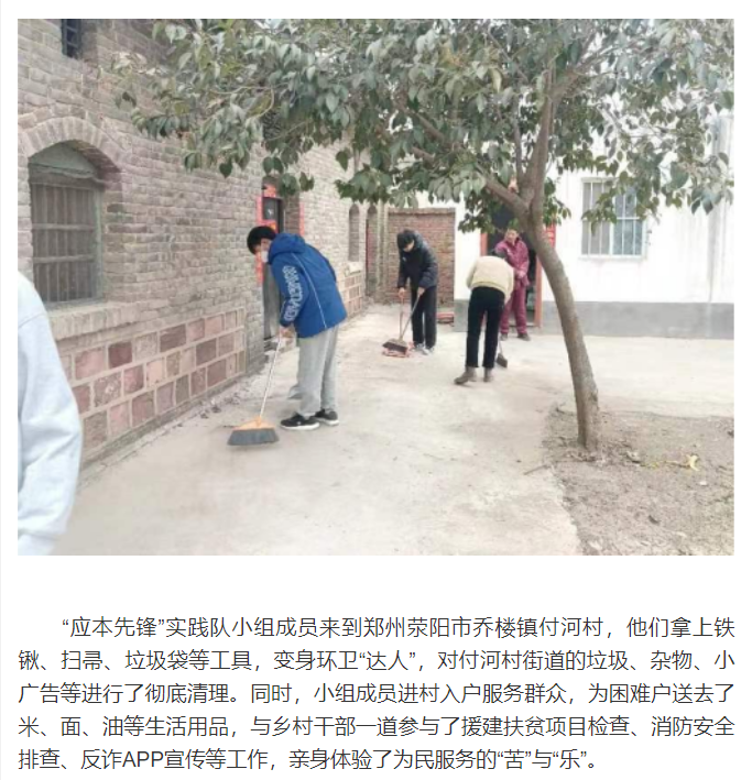 为深入学习宣传党的二十大精神,引导大学生上好理论与实践相结合的“大思政课”,不断创新大学生的思想政治教育工作。2023年寒假期间,河南应用技术职业学院本科部“应本先锋”实践队小组成员以“青春献给二十大,携手奋进新征程”为主题开展了各类社会实践活动。围绕乡村振兴、志愿服务、红色教育等专题,对党的二十大精神进行宣传和学习,让青春在全面建设社会主义现代化国家的火热实践中绽放绚丽之花。