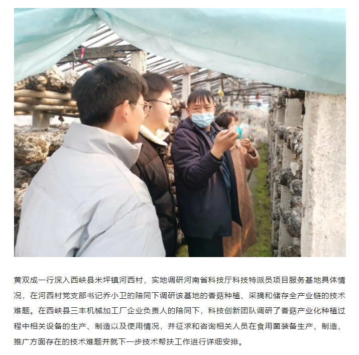 为深入学习贯彻党的二十大精神,落实河南省关于接续助力乡村振兴的工作要求,发挥高校科技创新优势,深入一线服务"三农”,2月19日,河南应用技术职业学院机电工程学院院长黄双成带领科技创新团队赴河南西峡开展实地调研,学校科研外事处处长袁清香全程指导调研活动。