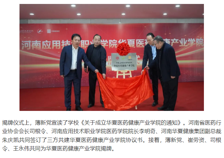 2月26日上午,河南应用技术职业学院华夏医药健康产业学院揭牌仪式在禹州市河南华夏健康集团六楼会议室成功举行。学校副校长陈君丽、薄新党,禹州市委常委、宣传部长、副市长赵丽娟,禹州市教体局局长崔劳资,禹州市中医药管理局局长程书年,河南省医药行业协会会长司根令,湖南省麓辰教育集团副总裁贺树华,河南华夏健康集团董事长王永伟等出席揭牌仪式,河南省医药行业协会职业教育分会各会员单位、禹州市中专和各高中学校领导、河南华夏健康集团以及学校相关部门负责人参加揭牌仪式。