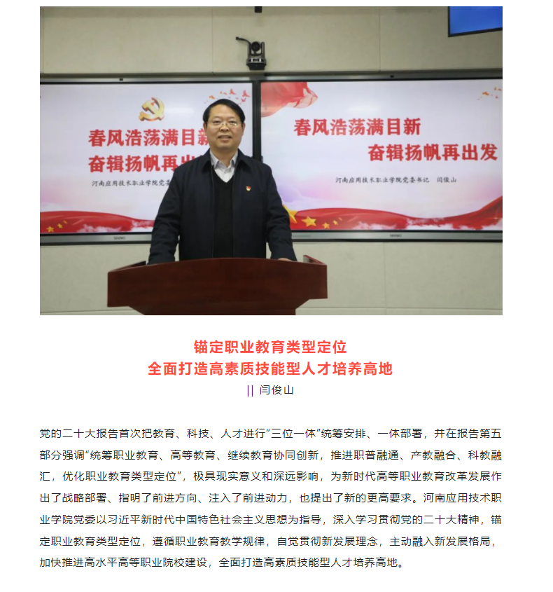 党的二十大报告首次把教育、科技、人才进行“三位一体”统筹安排、一体部署,并在报告第五部分强调“统筹职业教育、高等教育、继续教育协同创新,推进职普融通、产教融合、科教融汇,优化职业教育类型定位”,极具现实意义和深远影响,为新时代高等职业教育改革发展作出了战略部署、指明了前进方向、注入了前进动力,也提出了新的更高要求。河南应用技术职业学院党委以习近平新时代中国特色社会主义思想为指导,深入学习贯彻党的二十大精神,锚定职业教育类型定位,遵循职业教育教学规律,自觉贯彻新发展理念,主动融入新发展格局,加快推进高水平高等职业院校建设,全面打造高素质技能型人才培养高地。