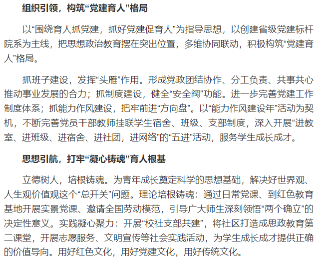 河南应用技术职业学院本科部党总支坚持以教师引导和学生自治为驱动,党建、思政与中心工作相结合,“组织引领、思想引航、文化导航、安全护航”四维发力,达到思政教育有效覆盖、管理服务有效提升、团队力量有效汇聚、教育质量有效提高的育人目标。本科部党总支在全省高校党建工作强基引领“三级联创”活动中,被评为“全省党建工作标杆院系”培育创建单位,本科部测控1901班李书奥同学获2022年度全省高校“大学生党员标兵”称号。