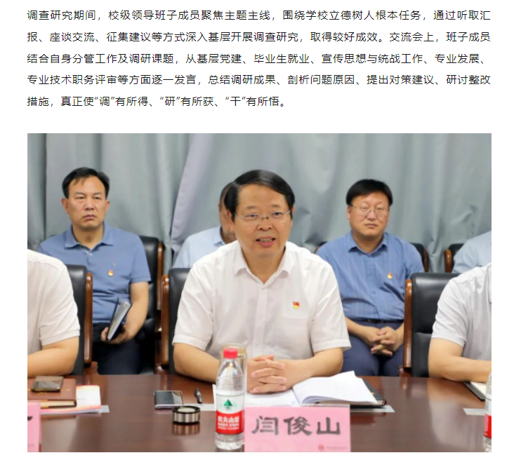 6月15日下午,河南应用技术职业学院召开校级领导班子主题教育调研成果交流会,分享交流调研成果,研讨贯彻落实举措,推动主题教育见行见效。省委教育工委、省教育厅主题教育第八巡回指导组副组长、河南职业技术学院文化旅游学院党总支书记兼党委组织部副部长王伟,指导组成员、河南省教育厅高教处二级主任科员陈庆峰,指导组成员、河南交通职业技术学院院办产业管理处综合管理科科长贾东豪到会指导。全体在校校领导、相关职能部门负责人参加会议。交流会由校党委书记闫俊山主持。