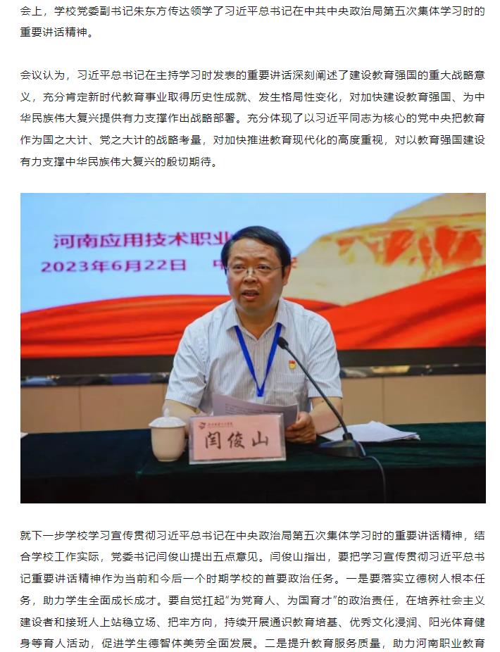 根据中央、省委、省委教育工委和省教育厅党组安排部署,结合学校暑期中层干部延安培训日程安排,6月22日,河南应用技术职业学院在陕西延安干部学院培训基地召开党委理论学习中心组(扩大)第九次集体学习会,学习宣传贯彻习近平总书记在中央政治局第五次集体学习时的重要讲话精神。学校党委理论学习中心组成员及中层干部参加学习,党委书记闫俊山主持会议。