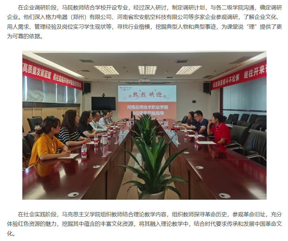 为进一步探索思政课“校、社、企”三协同育人模式,使思政课堂教学更加贴近社会,贴近企业需求,贴近学生实际,2023年河南应用技术职业学院暑期马克思主义学院组织全体教师开展社会调研活动,改革调研形式,创新活动载体,取得良好效果。