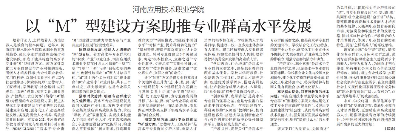 培养什么人、怎样培养人、为谁培养人是教育的根本问题。近年来,河南应用技术职业学院探索职业教育发展趋势,强化专业群建设理论探讨和建设实践,形成了独具特色的高水平专业群“M”型建设方案。该方案针对化工专业群建设与产业对接的短板,围绕人才培养目标、专业性职业教学、实用性科研、双属性文化再生产、综合社会性服务,探索实施以“立德树人、工匠精神,学历教育、社会培训,应用成果、‘双创’成果,双重文化、职业素养,产教共长、责任关怀”(简称“5M”模型)为模型的专业群建设方案,促进实现化工专业群建设与产业共生共长机制建立和应用,服务化工产业链高质量发展,实现高质量人才培养、高质量就业的目的。本文系2021年河南省高等教育教学研究与实践项目(项目编号:2021SJGLX881)“高水平专业群‘M’型建设方案助力职教专业与产业共生共长机制”阶段性成果。