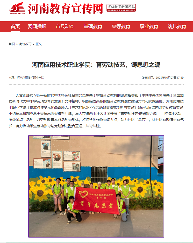 为贯彻落实习近平新时代中国特色社会主义思想关于学校劳动教育的论述指导和《中共中央 国务院关于全面加强新时代大中小学劳动教育的意见》文件精神,积极探索高职院校劳动教育课程建设方向和实施策略,河南应用技术职业学院《精准对接多元化高素质人才需求的BOPPPS劳动教育模式创新与实践》教研项目课题组劳动教育实践小组与本科部党总支青年志愿者携手共建,与古荥镇西山社区共同开展“育劳动技艺·铸思想之魂——打造社区彩绘微景点”活动,以劳动教育实践活动为载体,将墙绘创作作为切入点,助力社区“美容”,让社区有颜值更有气质,有力推动学生劳动教育与党建活动融合互通、共育共建。