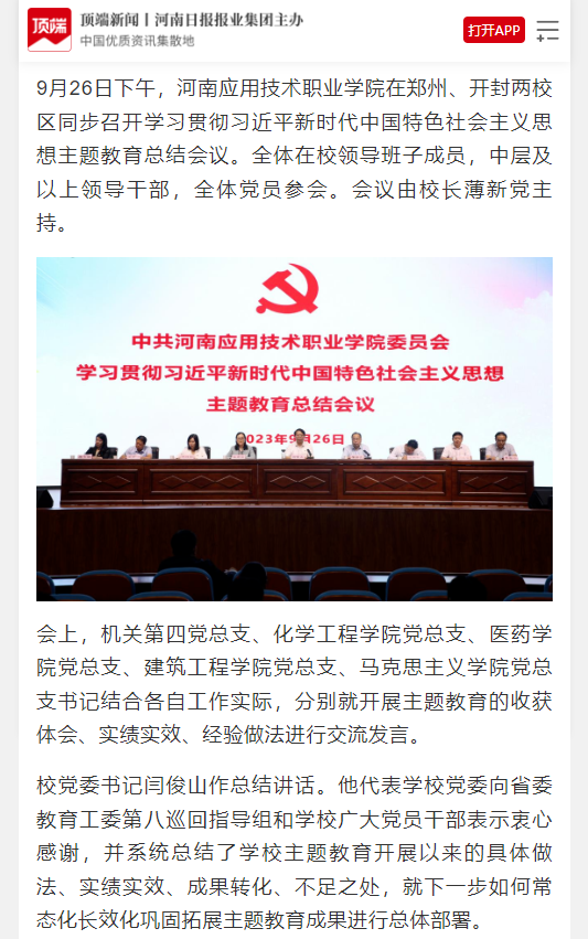 9月26日下午,河南应用技术职业学院在郑州、开封两校区同步召开学习贯彻习近平新时代中国特色社会主义思想主题教育总结会议。全体在校领导班子成员,中层及以上领导干部,全体党员参会。会议由校长薄新党主持。