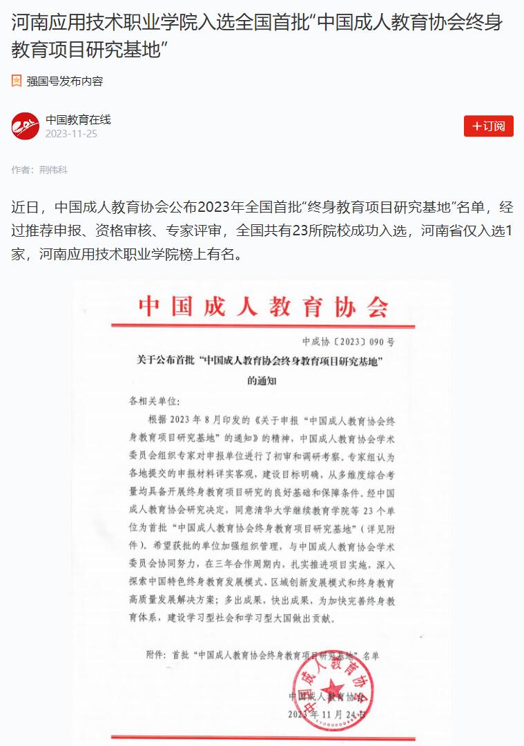 近日,中国成人教育协会公布2023年全国首批“终身教育项目研究基地”名单,经过推荐申报、资格审核、专家评审,全国共有23所院校成功入选,河南省仅入选1家,河南应用技术职业学院榜上有名。