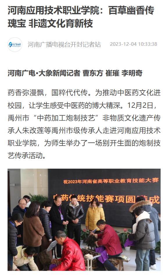 药香弥漫飘,国粹代代传。为推动中医药文化进校园,让学生感受中医药的博大精深。12月2日,禹州市“中药加工炮制技艺”非物质文化遗产传承人朱改莲等禹州市级传承人走进河南应用技术职业学院,为师生举办了一场别开生面的炮制技艺传承活动。