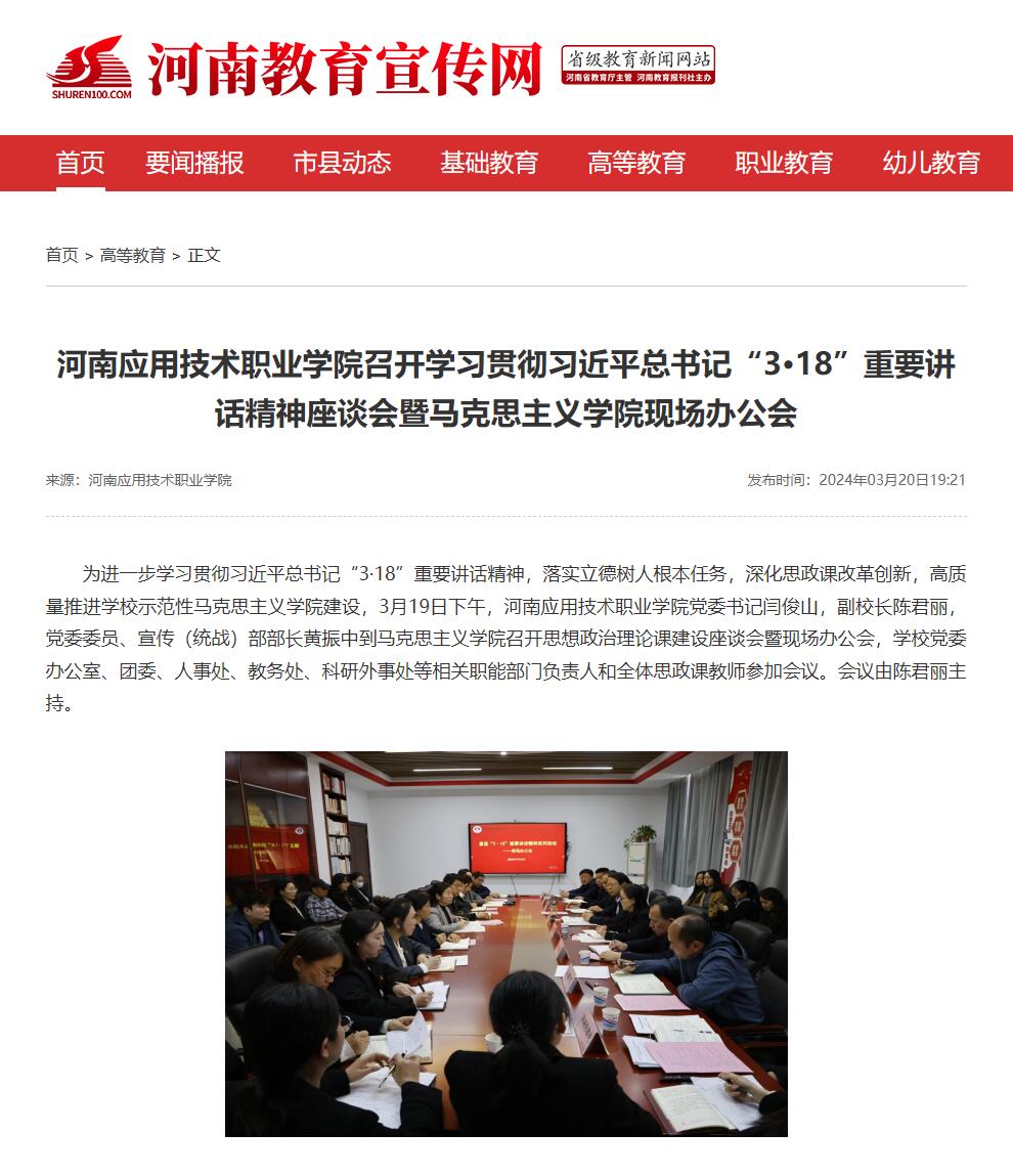 为进一步学习贯彻习近平总书记“3·18”重要讲话精神,落实立德树人根本任务,深化思政课改革创新,高质量推进学校示范性马克思主义学院建设,3月19日下午,河南应用技术职业学院党委书记闫俊山,副校长陈君丽,党委委员、宣传(统战)部部长黄振中到马克思主义学院召开思想政治理论课建设座谈会暨现场办公会,学校党委办公室、团委、人事处、教务处、科研外事处等相关职能部门负责人和全体思政课教师参加会议。会议由陈君丽主持。