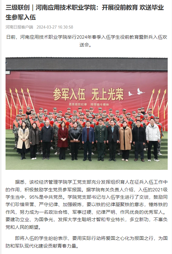 日前,河南应用技术职业学院举行2024年春季入伍学生役前教育暨新兵入伍欢送会。