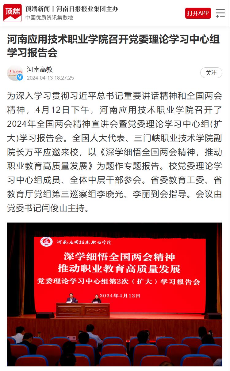 为深入学习贯彻习近平总书记重要讲话精神和全国两会精神,4月12日下午,河南应用技术职业学院召开了2024年全国两会精神宣讲会暨党委理论学习中心组(扩大)学习报告会。全国人大代表、三门峡职业技术学院副院长万平应邀来校,以《深学细悟全国两会精神,推动职业教育高质量发展》为题作专题报告。校党委理论学习中心组成员、全体中层干部参会。省委教育工委、省教育厅党组第三巡察组李晓光、李丽到会指导。会议由党委书记闫俊山主持。