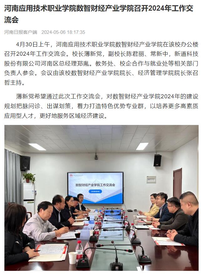 4月30日上午,河南应用技术职业学院数智财经产业学院在该校办公楼召开2024年工作交流会。校长薄新党,副校长陈君丽、常新中,新道科技股份有限公司河南区总经理郑胤,教务处、校企合作与就业处等相关部门负责人参会。会议由该校数智财经产业学院院长、经济管理学院院长张召哲主持。