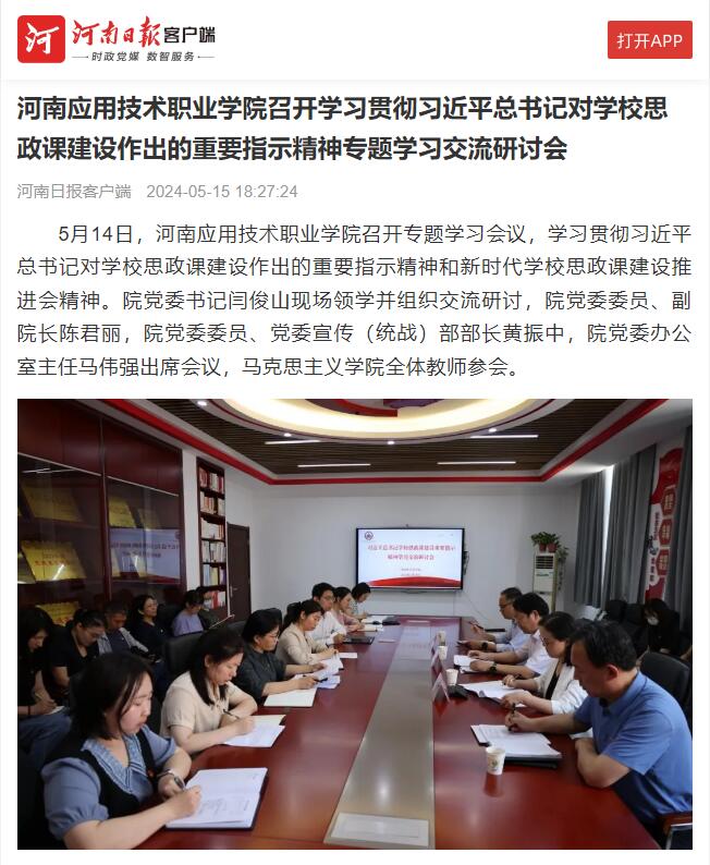 5月14日,河南应用技术职业学院召开专题学习会议,学习贯彻习近平总书记对学校思政课建设作出的重要指示精神和新时代学校思政课建设推进会精神。院党委书记闫俊山现场领学并组织交流研讨,院党委委员、副院长陈君丽,院党委委员、党委宣传(统战)部部长黄振中,院党委办公室主任马伟强出席会议,马克思主义学院全体教师参会。