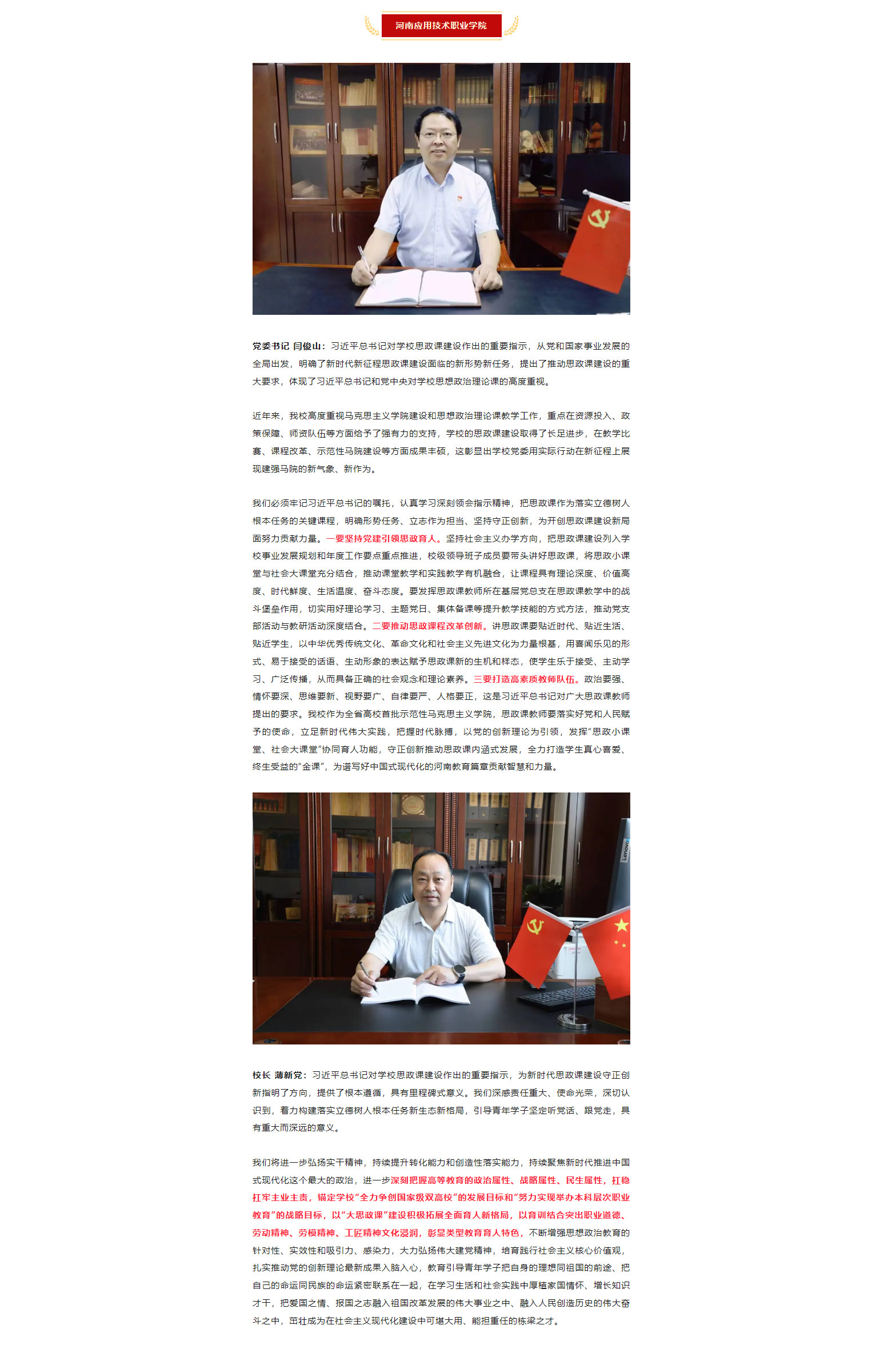 新时代学校思政课建设推进会5月11日在北京召开,会上传达了习近平总书记重要指示。习近平总书记对学校思政课建设作出重要指示强调,不断开创新时代思政教育新局面,努力培养更多让党放心、爱国奉献、担当民族复兴重任的时代新人。河南高校书记校长第一时间学习领会习近平总书记关于思政课建设的重要指示精神,并结合学校工作进行了热议。