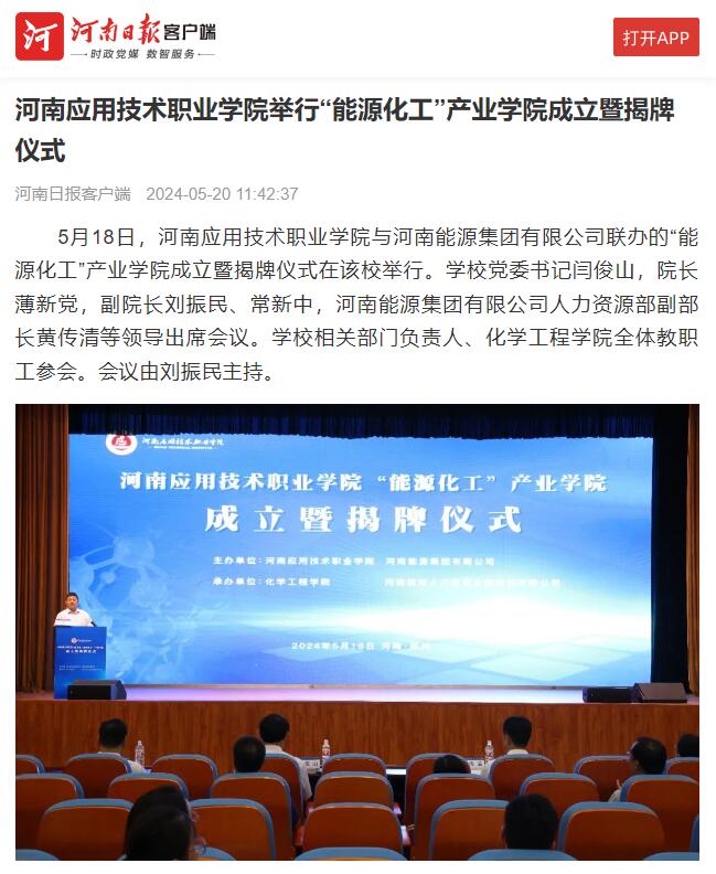 5月18日,河南应用技术职业学院与河南能源集团有限公司联办的“能源化工”产业学院成立暨揭牌仪式在该校举行。学校党委书记闫俊山,院长薄新党,副院长刘振民、常新中,河南能源集团有限公司人力资源部副部长黄传清等领导出席会议。学校相关部门负责人、化学工程学院全体教职工参会。会议由刘振民主持。