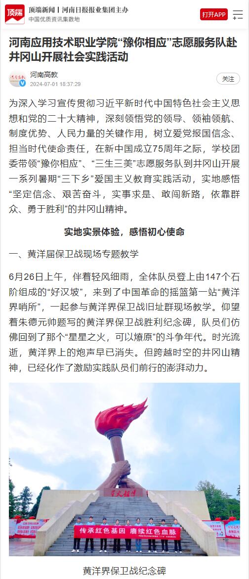 为深入学习贯彻习近平新时代中国特色社会主义思想和党的二十大精神,深刻领悟党的领导、领袖领航、制度优势、人民力量的关键作用,树立爱党报国信念、担当时代使命责任,在新中国成立75周年之际,学校团委带领“豫你相应”、“三生三美”志愿服务队到井冈山开展一系列暑期“三下乡”爱国主义教育实践活动,实地感悟“坚定信念、艰苦奋斗,实事求是、敢闯新路,依靠群众、勇于胜利”的井冈山精神。