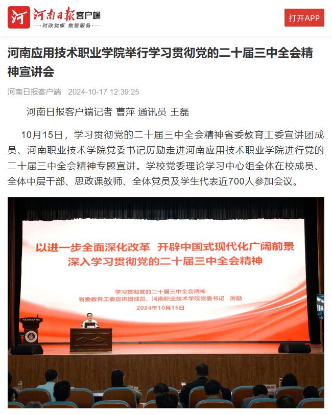 10月15日,学习贯彻党的二十届三中全会精神省委教育工委宣讲团成员、河南职业技术学院党委书记厉励走进河南应用技术职业学院进行党的二十届三中全会精神专题宣讲。学校党委理论学习中心组全体在校成员、全体中层干部、思政课教师、全体党员及学生代表近700人参加会议。
