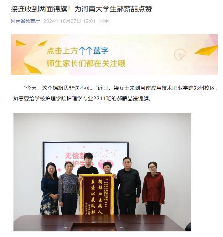 “今天,这个锦旗我非送不可。”近日,梁女士来到河南应用技术职业学院郑州校区,执意要给学校护理学院护理学专业2211班的郝薪喆送锦旗。