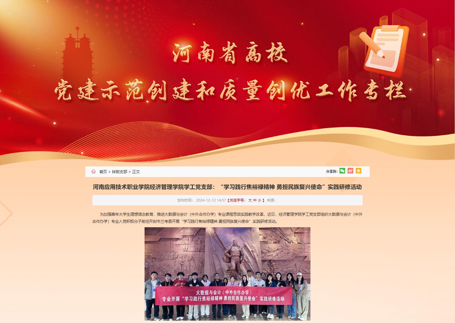 为加强青年大学生理想信念教育,推进大数据与会计(中外合作办学)专业课程思政实践教学改革,近日,经济管理学院学工党支部组织大数据与会计(中外合作办学)专业入党积极分子前往开封市兰考县开展“学习践行焦裕禄精神 勇担民族复兴使命”实践研修活动。