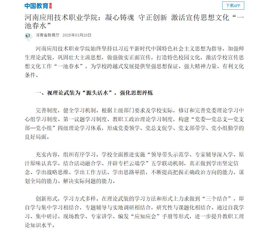 河南应用技术职业学院始终坚持以习近平新时代中国特色社会主义思想为指导,加强师生理论武装,巩固壮大主流思想,做强做实正面宣传,打造特色校园文化,激活学校宣传思想文化工作“一池春水”,为学校跨越式发展提供坚强思想保证、强大精神力量、有利文化条件。