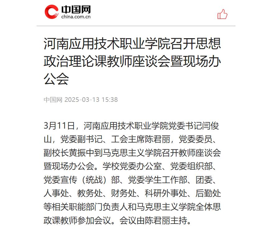 3月11日,河南应用技术职业学院党委书记闫俊山,党委副书记、工会主席陈君丽,党委委员、副校长黄振中到马克思主义学院召开教师座谈会暨现场办公会。学校党委办公室、党委组织部、党委宣传(统战)部、党委学生工作部、团委、人事处、教务处、财务处、科研外事处、后勤处等相关职能部门负责人和马克思主义学院全体思政课教师参加会议。会议由陈君丽主持。