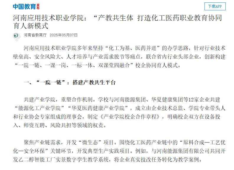河南应用技术职业学院多年来坚持“化工为基、医药并进”的办学思路,针对行业技术壁垒高、安全风险大、人才培养与产业需求脱节等痛点,联合省内行业头部企业,创新构建“一院一链、一课一岗、一标一体、双课堂四融合”校企协同育人模式。