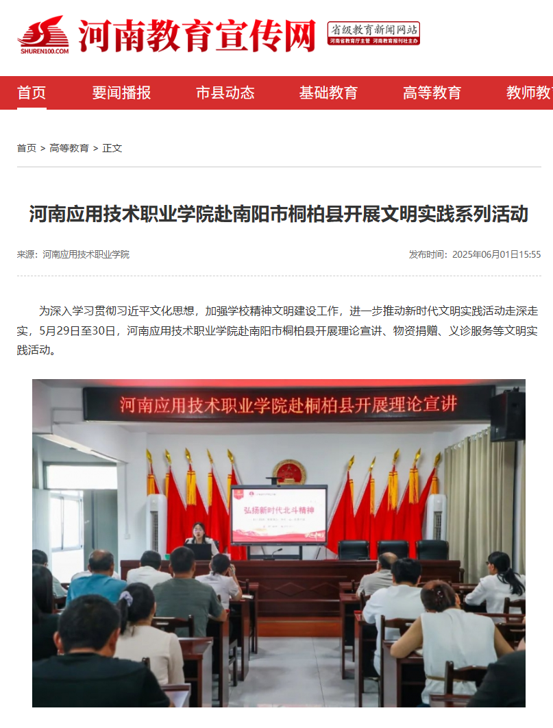为深入学习贯彻习近平文化思想,加强学校精神文明建设工作,进一步推动新时代文明实践活动走深走实,5月29日至30日,河南应用技术职业学院赴南阳市桐柏县开展理论宣讲、物资捐赠、义诊服务等文明实践活动。