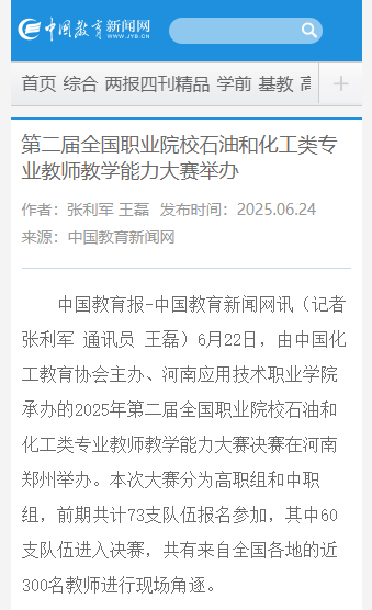 6月22日,由中国化工教育协会主办、河南应用技术职业学院承办的2025年第二届全国职业院校石油和化工类专业教师教学能力大赛决赛在河南郑州举办。本次大赛分为高职组和中职组,前期共计73支队伍报名参加,其中60支队伍进入决赛,共有来自全国各地的近300名教师进行现场角逐。