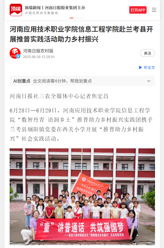 6月28日—6月29日,河南应用技术职业学院信息工程学院“数智丹青 语润乡土”推普助力乡村振兴实践团携手兰考县堌阳镇党委在西关小学开展“推普助力乡村振兴”社会实践活动。