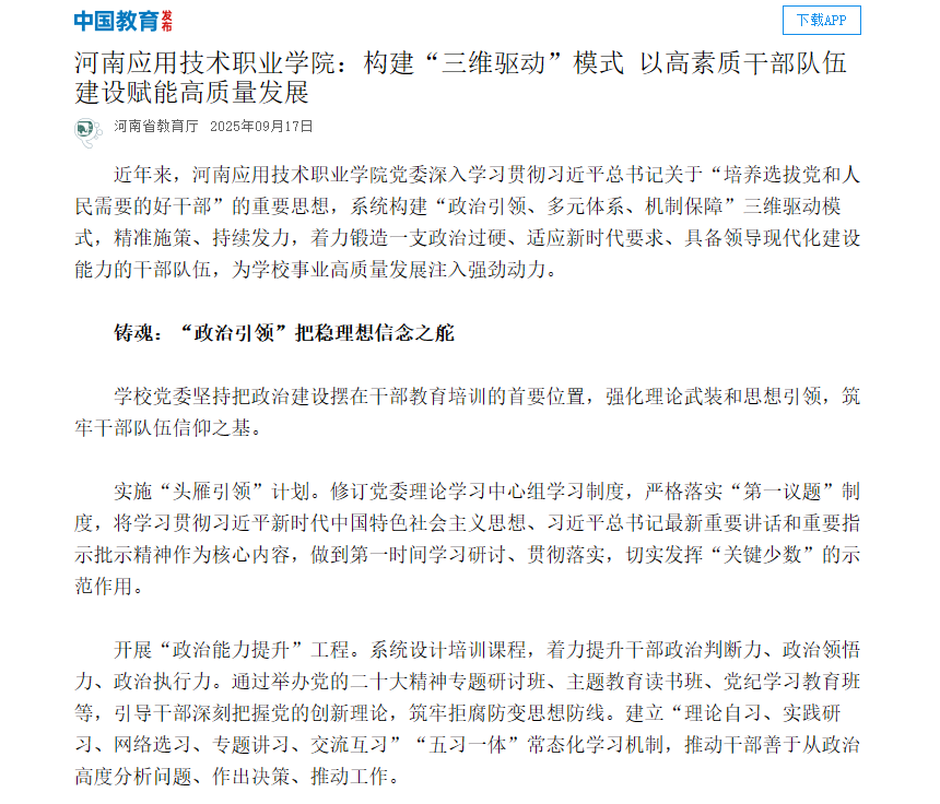 中国教育发布、河南省教育厅、河南高教:河南应用技术职业学院:构建“三维驱动”模式 以高素质干部队伍建设赋能高质量发展