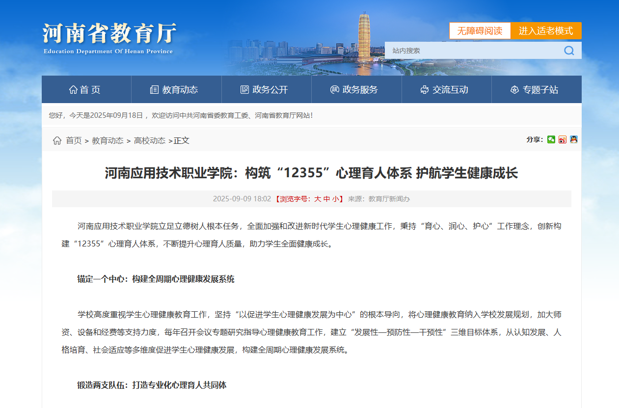 河南省教育厅:河南应用技术职业学院:构筑“12355”心理育人体系 护航学生健康成长