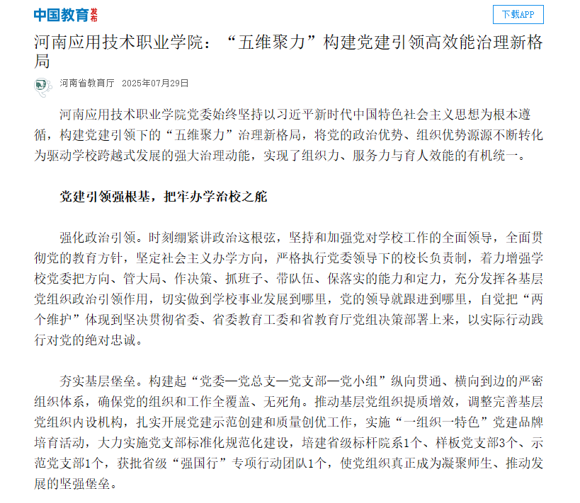 河南应用技术职业学院党委始终坚持以习近平新时代中国特色社会主义思想为根本遵循,构建党建引领下的“五维聚力”治理新格局,将党的政治优势、组织优势源源不断转化为驱动学校跨越式发展的强大治理动能,实现了组织力、服务力与育人效能的有机统一。