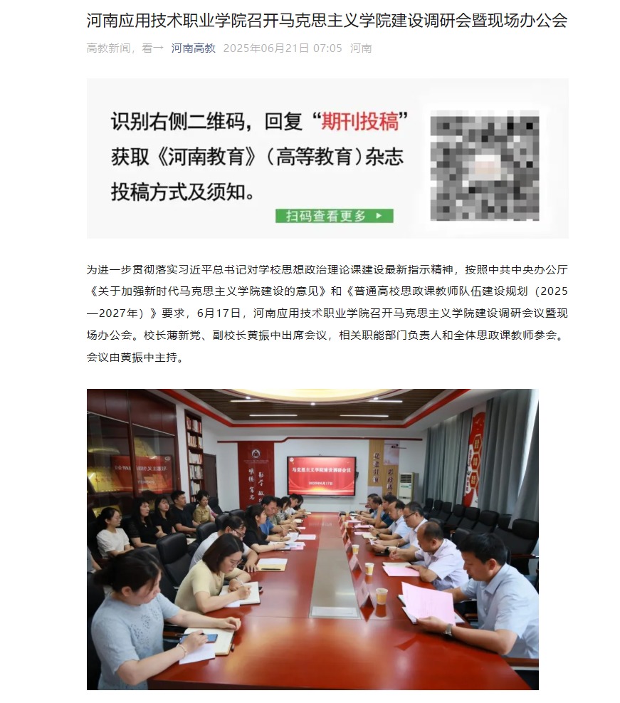 为进一步贯彻落实习近平总书记对学校思想政治理论课建设最新指示精神,按照中共中央办公厅《关于加强新时代马克思主义学院建设的意见》和《普通高校思政课教师队伍建设规划(2025—2027年)》要求,6月17日,河南应用技术职业学院召开马克思主义学院建设调研会议暨现场办公会。校长薄新党、副校长黄振中出席会议,相关职能部门负责人和全体思政课教师参会。会议由黄振中主持。