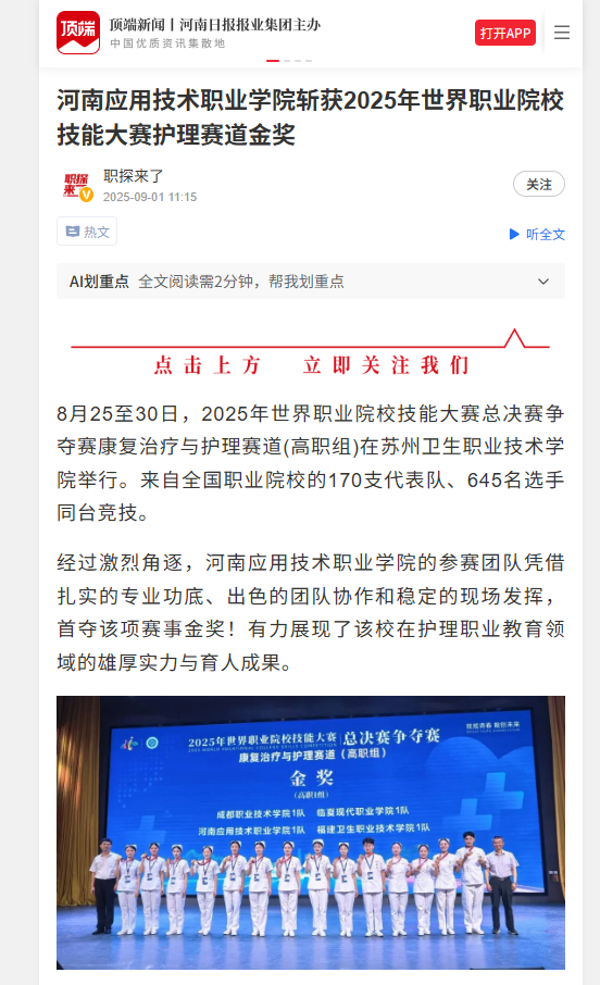 8月25至30日,2025年世界职业院校技能大赛总决赛争夺赛康复治疗与护理赛道(高职组)在苏州卫生职业技术学院举行。来自全国职业院校的170支代表队、645名选手同台竞技。