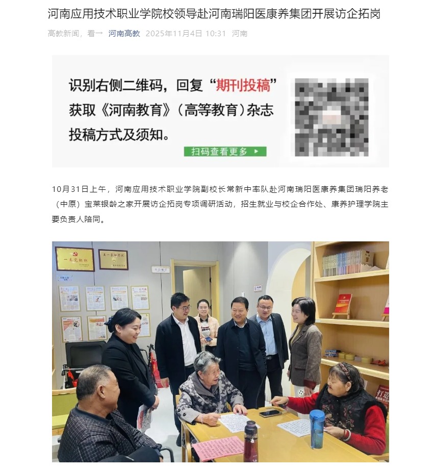 10月31日上午,河南应用技术职业学院副校长常新中率队赴河南瑞阳医康养集团瑞阳养老(中原)宝莱银龄之家开展访企拓岗专项调研活动,招生就业与校企合作处、康养护理学院主要负责人陪同。