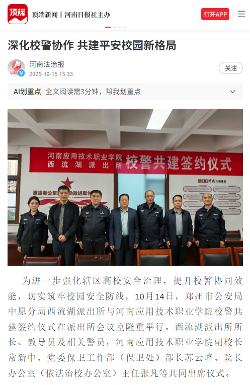 为进一步强化辖区高校安全治理,提升校警协同效能,切实筑牢校园安全防线,10月14日,郑州市公安局中原分局西流湖派出所与河南应用技术职业学院校警共建签约仪式在派出所会议室隆重举行。西流湖派出所所长、教导员及相关警员,河南应用技术职业学院副校长常新中、党委保卫工作部(保卫处)部长苏云峰、院长办公室(依法治校办公室)主任张凡等共同出席仪式。