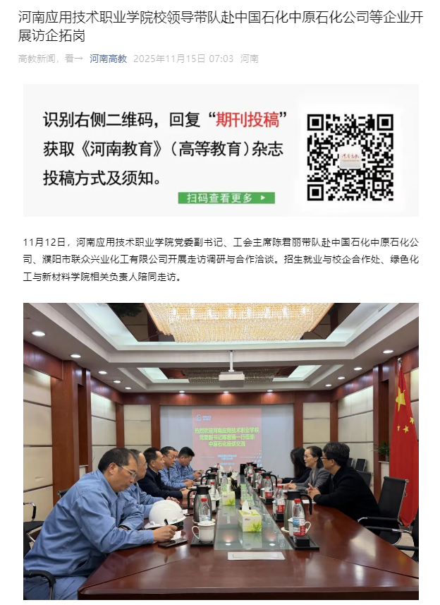 11月12日,河南应用技术职业学院党委副书记、工会主席陈君丽带队赴中国石化中原石化公司、濮阳市联众兴业化工有限公司开展走访调研与合作洽谈。招生就业与校企合作处、绿色化工与新材料学院相关负责人陪同走访。