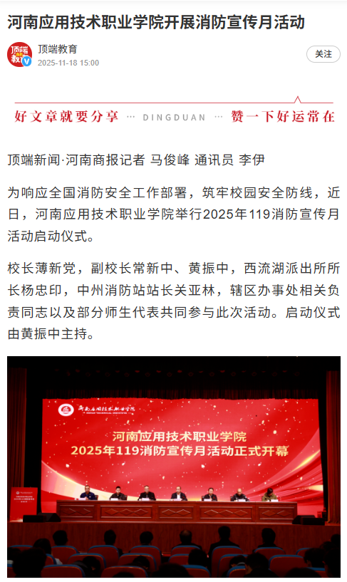 为响应全国消防安全工作部署,筑牢校园安全防线,近日,河南应用技术职业学院举行2025年119消防宣传月活动启动仪式。校长薄新党,副校长常新中、黄振中,西流湖派出所所长杨忠印,中州消防站站长关亚林,辖区办事处相关负责同志以及部分师生代表共同参与此次活动。启动仪式由黄振中主持。
