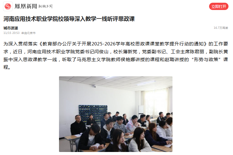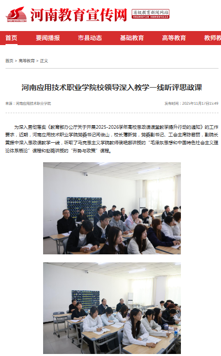 为深入贯彻落实《教育部办公厅关于开展2025-2026学年高校思政课课堂教学提升行动的通知》的工作要求,近日,河南应用技术职业学院党委书记闫俊山,校长薄新党,党委副书记、工会主席陈君丽,副院长黄振中深入思政课教学一线,听取了马克思主义学院教师侯艳娜讲授的“毛泽东思想和中国特色社会主义理论体系概论”课程和赵璐讲授的“形势与政策”课程。