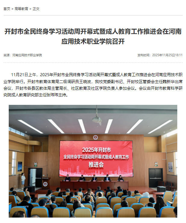 11月21日上午,2025年开封市全民终身学习活动周开幕式暨成人教育工作推进会在河南应用技术职业学院举行。开封市教育体育局二级调研员王晓波,我校党委副书记、开封校区管委会主任魏新华出席会议,开封市各县区教体局主管局长、社区教育及社区学院负责人参加会议。会议由开封市教育科学研究院成人教育研究部主任张玮玮主持。