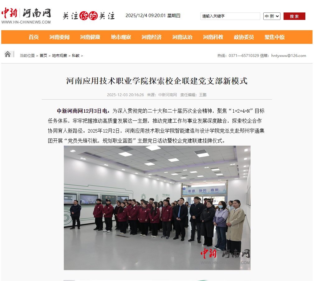 上一条:中国教育报纸媒、中国教育新闻网、全国党媒信息公共平台、中国教育报:河南应用技术职业学院智能制造与装备学院党建服务队助力乡村振兴 下一条:顶端新闻、大象新闻:校企携手,共探协同发展新路径