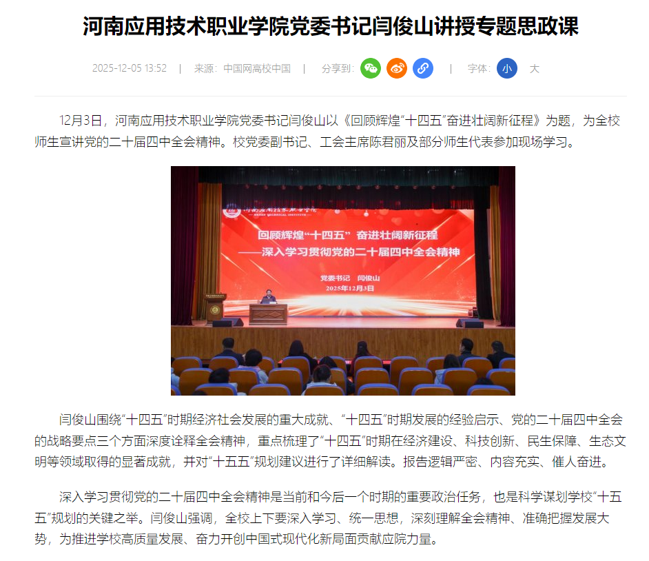 12月3日,河南应用技术职业学院党委书记闫俊山以《回顾辉煌“十四五”奋进壮阔新征程》为题,为全校师生宣讲党的二十届四中全会精神。校党委副书记、工会主席陈君丽及部分师生代表参加现场学习。