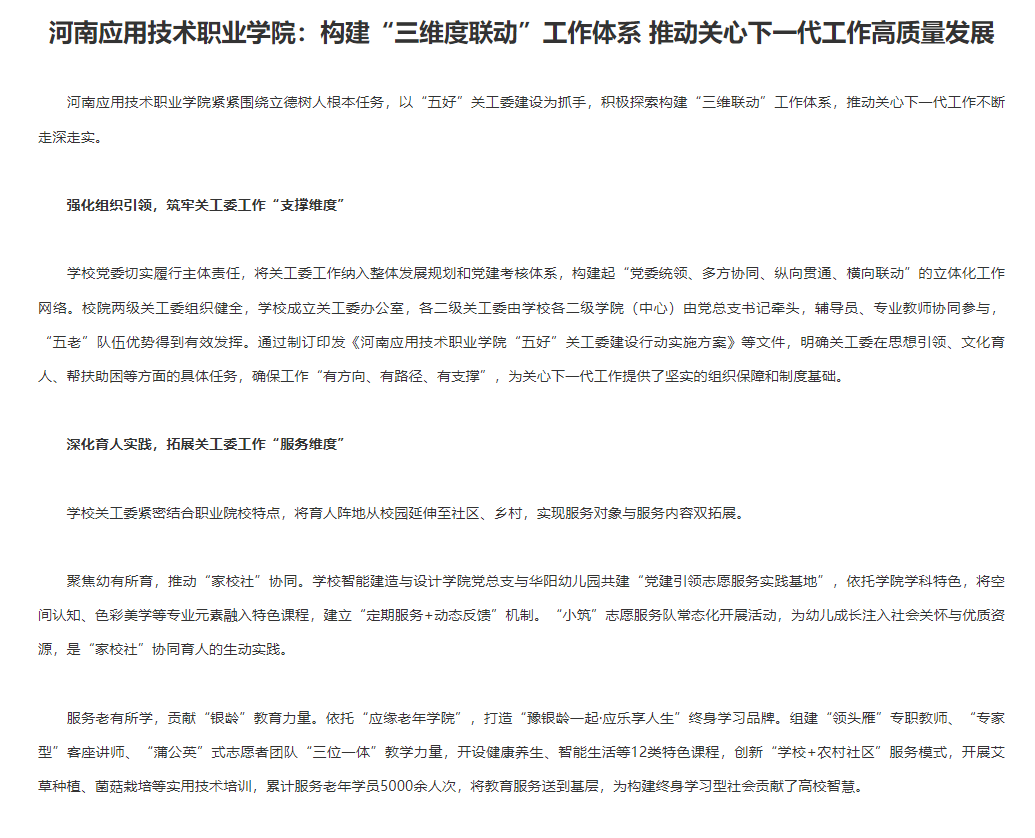 河南应用技术职业学院紧紧围绕立德树人根本任务,以“五好”关工委建设为抓手,积极探索构建“三维联动”工作体系,推动关心下一代工作不断走深走实。